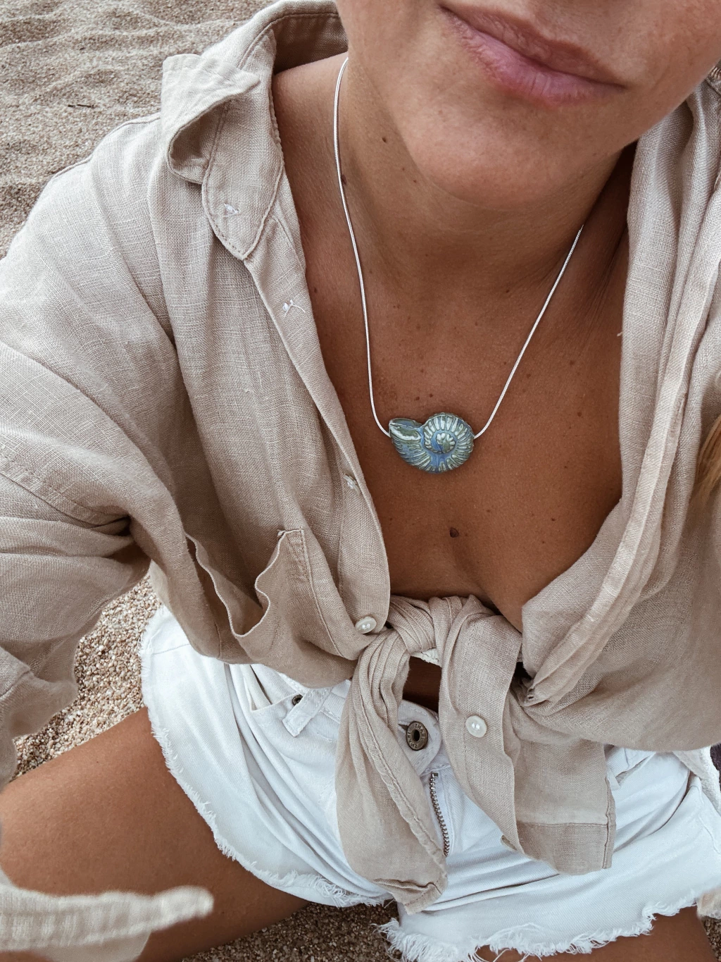 Dije importado de caracol de cerámica natural color celeste y destellos verdes pastel