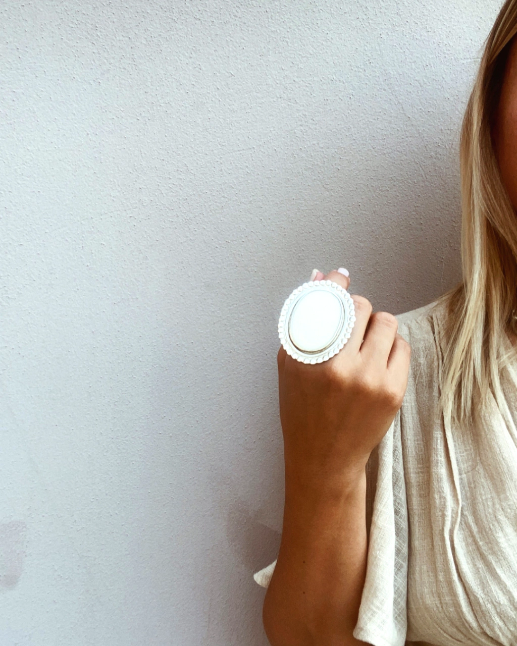 - Especial anillo ovalado con detalles a cincel y centro de resina vegetal color crudo. Diámetro de 4cm. Alianza abierta para poder regular su medida. Pieza realizada en plata baja.