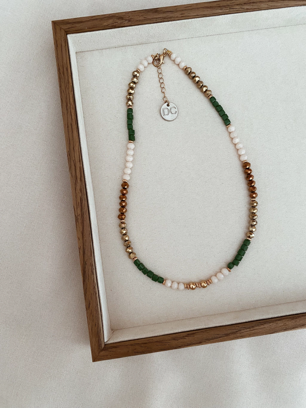 Colgante realizado con cuentas de cristal de roca importado tornasolado en diferentes tonos cobre, cristales cuadrados verdes