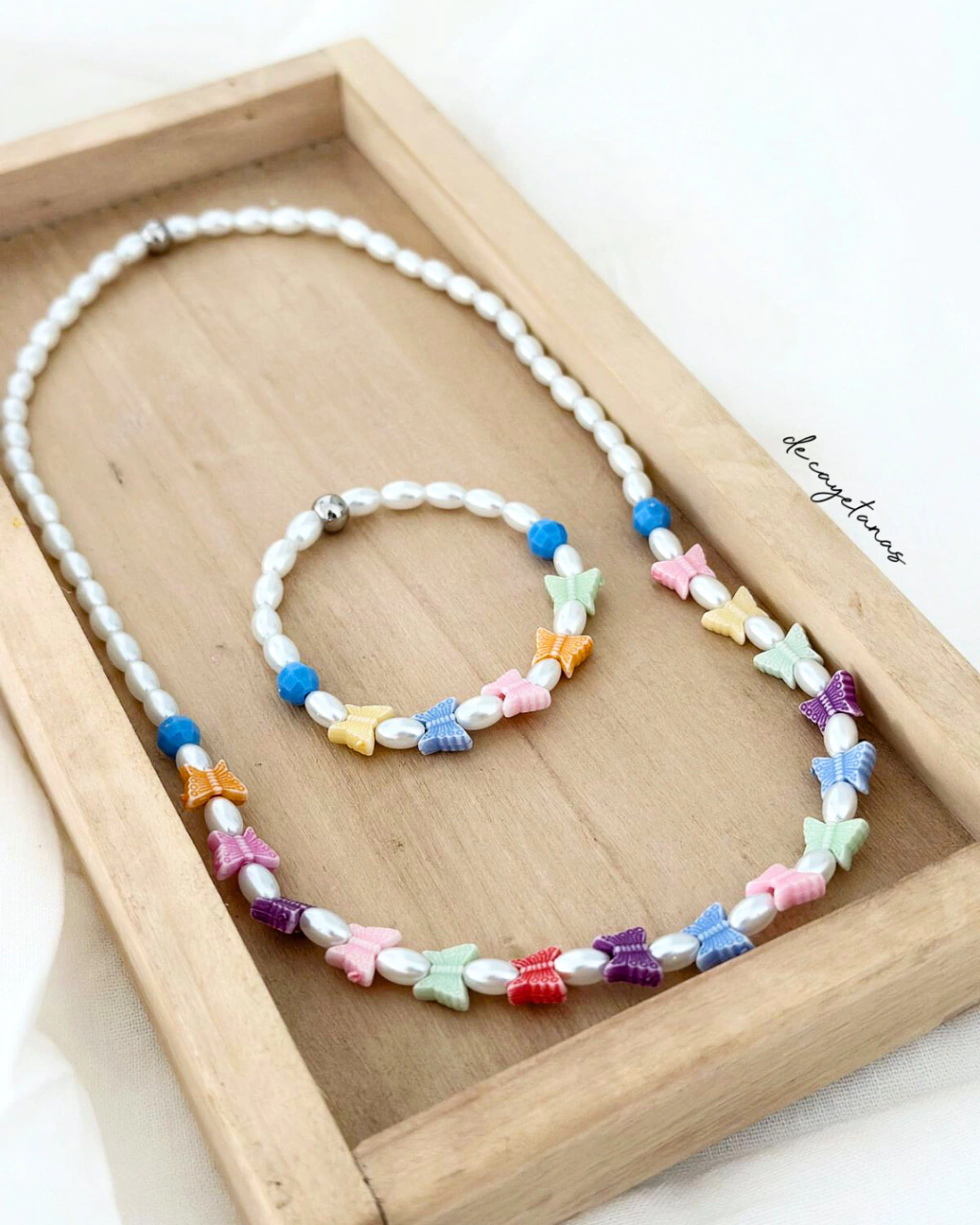 Pulsera y colgante elasticos realizados con perlas ovaladas, mariposas caladas multicolor y bolitas de acrílico